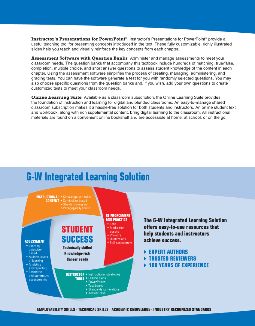 EMPLOYABILITY SKILLS ∙ TECHNICAL SKILLS ∙ ACADEMIC KNOWLEDGE ∙ INDUSTRY RECOGNIZED STANDARDS The G-W Integrated Learning Solution offers easy-to-use resources that help students and instructors achieve success. EXPERT AUTHORS TRUSTED REVIEWERS 100 YEARS OF EXPERIENCE G-W Integrated Learning Solution ASSESSMENT • Learning objective- based • Multiple levels of learning • Analytics and reporting • Formative and summative assessments • Knowledge and skills • Curriculum-based • Standards-aligned • Pedagogically sound INSTRUCTIONAL CONTENT INSTRUCTOR TOOLS • Instructional strategies • Lesson plans • PowerPoints • Test banks • Standards correlations • Answer keys REINFORCEMENT AND PRACTICE • Labs • Media-rich assets • Projects • Illustrations • Self-assessment STUDENT SUCCESS Technically skilled Knowledge-rich Career ready Instructor’s Presentations for PowerPoint® Instructor’s Presentations for PowerPoint® provide a useful teaching tool for presenting concepts introduced in the text. These fully customizable, richly illustrated slides help you teach and visually reinforce the key concepts from each chapter. Assessment Software with Question Banks Administer and manage assessments to meet your classroom needs. The question banks that accompany this textbook include hundreds of matching, true/false, completion, multiple choice, and short answer questions to assess student knowledge of the content in each chapter. Using the assessment software simplifies the process of creating, managing, administering, and grading tests. You can have the software generate a test for you with randomly selected questions. You may also choose specific questions from the question banks and, if you wish, add your own questions to create customized tests to meet your classroom needs. Online Learning Suite Available as a classroom subscription, the Online Learning Suite provides the foundation of instruction and learning for digital and blended classrooms. An easy-to-manage shared classroom subscription makes it a hassle-free solution for both students and instructors. An online student text and workbook, along with rich supplemental content, bring digital learning to the classroom. All instructional materials are found on a convenient online bookshelf and are accessible at home, at school, or on the go.
