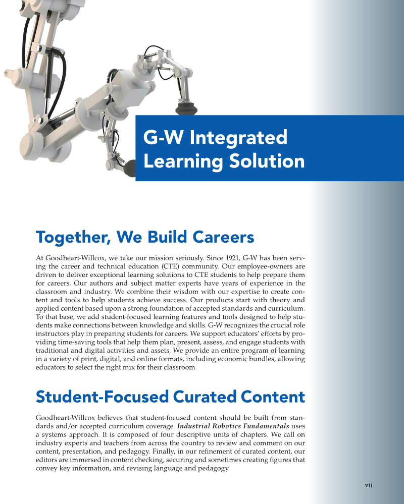 vii G-W Integrated Learning Solution Together, We Build Careers At Goodheart-Willcox, we take our mission seriously. Since 1921, G-W has been serv- ing the career and technical education (CTE) community. Our employee-owners are driven to deliver exceptional learning solutions to CTE students to help prepare them for careers. Our authors and subject matter experts have years of experience in the classroom and industry. We combine their wisdom with our expertise to create con- tent and tools to help students achieve success. Our products start with theory and applied content based upon a strong foundation of accepted standards and curriculum. To that base, we add student-focused learning features and tools designed to help stu- dents make connections between knowledge and skills. G-W recognizes the crucial role instructors play in preparing students for careers. We support educators’ efforts by pro- viding time-saving tools that help them plan, present, assess, and engage students with traditional and digital activities and assets. We provide an entire program of learning in a variety of print, digital, and online formats, including economic bundles, allowing educators to select the right mix for their classroom. Student-Focused Curated Content Goodheart-Willcox believes that student-focused content should be built from stan- dards and/or accepted curriculum coverage. Industrial Robotics Fundamentals uses a systems approach. It is composed of four descriptive units of chapters. We call on industry experts and teachers from across the country to review and comment on our content, presentation, and pedagogy. Finally, in our refinement of curated content, our fi editors are immersed in content checking, securing and sometimes creating fi gures that fi convey key information, and revising language and pedagogy.