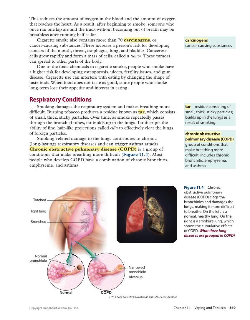 This reduces the amount of oxygen in the blood and the amount of oxygen that reaches the heart. As a result, after beginning to smoke, someone who once ran one lap around the track without becoming out of breath may be breathless after running half as far. Cigarette smoke also contains more than 70 carcinogens, or cancer-causing substances. These increase a person’s risk for developing cancers of the mouth, throat, esophagus, lung, and bladder. Cancerous cells grow rapidly and form a mass of cells, called a tumor. These tumors can spread to other parts of the body. Due to the toxic chemicals in cigarette smoke, people who smoke have a higher risk for developing osteoporosis, ulcers, fertility issues, and gum disease. Cigarette use can interfere with eating by changing the shape of taste buds. When food does not taste as good, some people who smoke long-term lose their appetite and interest in eating. Respiratory Conditions Smoking damages the respiratory system and makes breathing more difficult. Burning tobacco produces a residue known as tar, which consists of small, thick, sticky particles. Over time, as smoke repeatedly passes through the bronchial tubes, tar builds up in the lungs. Tar disrupts the ability of fine, hair-like projections called cilia to effectively clear the lungs of foreign particles. Smoking-related damage to the lungs contributes to chronic (long-lasting) respiratory diseases and can trigger asthma attacks. Chronic obstructive pulmonary disease (COPD) is a group of conditions that make breathing more difficult (Figure 11.4). Most people who develop COPD have a combination of chronic bronchitis, emphysema, and asthma. carcinogens cancer-causing substances tar residue consisting of small, thick, sticky particles builds up in the lungs as a result of smoking chronic obstructive pulmonary disease (COPD) group of conditions that make breathing more difficult includes chronic bronchitis, emphysema, and asthma Right lung Trachea Bronchus Normal bronchiole Narrowed bronchiole Alveolus Normal COPD Left: © Body Scientific International Right: iStock.com/Nerthuz Figure 11.4 Chronic obstructive pulmonary disease (COPD) clogs the bronchioles and damages the lungs, making it more difficult to breathe. On the left is a normal, healthy lung. On the right is a smoker’s lung, which shows the cumulative effects of COPD. What three lung diseases are grouped in COPD? Copyright Goodheart-Willcox Co., Inc. Chapter 11 Vaping and Tobacco 369