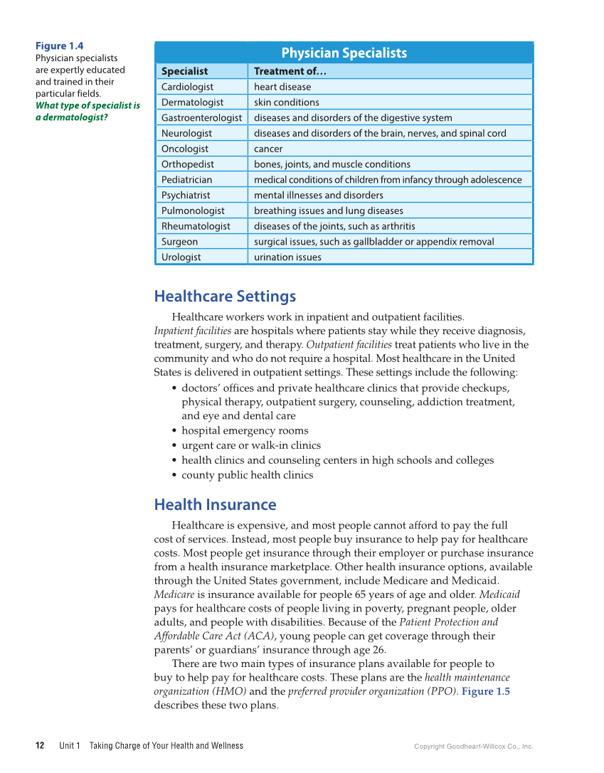 Unit 1 Taking Charge of Your Health and Wellness Copyright Goodheart-Willcox Co., Inc. 12 Healthcare Settings Healthcare workers work in inpatient and outpatient facilities. Inpatient facilities are hospitals where patients stay while they receive diagnosis, treatment, surgery, and therapy. Outpatient facilities treat patients who live in the community and who do not require a hospital. Most healthcare in the United States is delivered in outpatient settings. These settings include the following: • doctors’ offices and private healthcare clinics that provide checkups, physical therapy, outpatient surgery, counseling, addiction treatment, and eye and dental care • hospital emergency rooms • urgent care or walk-in clinics • health clinics and counseling centers in high schools and colleges • county public health clinics Health Insurance Healthcare is expensive, and most people cannot afford to pay the full cost of services. Instead, most people buy insurance to help pay for healthcare costs. Most people get insurance through their employer or purchase insurance from a health insurance marketplace. Other health insurance options, available through the United States government, include Medicare and Medicaid. Medicare is insurance available for people 65 years of age and older. Medicaid pays for healthcare costs of people living in poverty, pregnant people, older adults, and people with disabilities. Because of the Patient Protection and Affordable Care Act (ACA), young people can get coverage through their parents’ or guardians’ insurance through age 26. There are two main types of insurance plans available for people to buy to help pay for healthcare costs. These plans are the health maintenance organization (HMO) and the preferred provider organization (PPO). Figure 1.5 describes these two plans. Physician Specialists Specialist Treatment of… Cardiologist heart disease Dermatologist skin conditions Gastroenterologist diseases and disorders of the digestive system Neurologist diseases and disorders of the brain, nerves, and spinal cord Oncologist cancer Orthopedist bones, joints, and muscle conditions Pediatrician medical conditions of children from infancy through adolescence Psychiatrist mental illnesses and disorders Pulmonologist breathing issues and lung diseases Rheumatologist diseases of the joints, such as arthritis Surgeon surgical issues, such as gallbladder or appendix removal Urologist urination issues Figure 1.4 Physician specialists are expertly educated and trained in their particular fields. What type of specialist is a dermatologist?